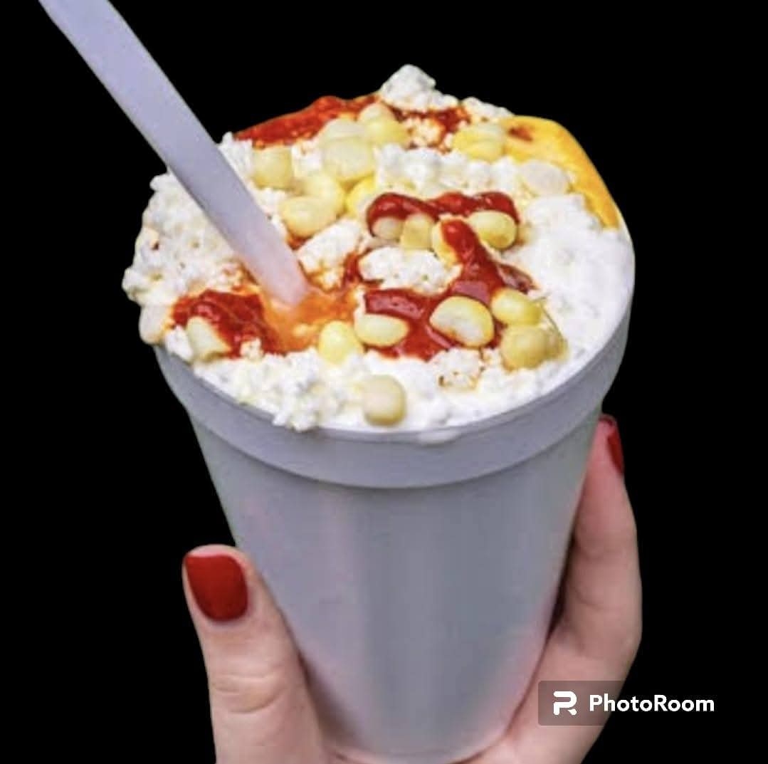 Elote desgranado de medio litro con mayonesa, crema, queso amarillo, queso fresco, chile y limón.