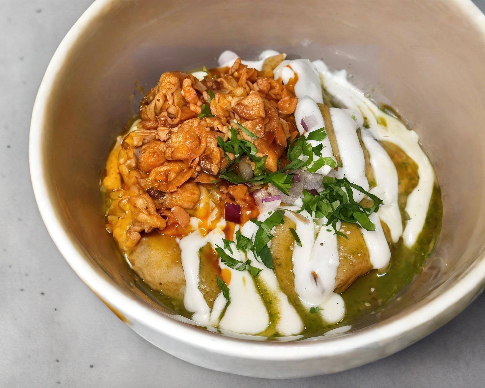 Frijoles, combinación de quesos, crema, aguacate, cebolla y salsa verde o roja o poblana....NO OLVIDES SELECCIONAR TU SALSA!! porción de salsa 1 8oz ó 2 de 4oz
