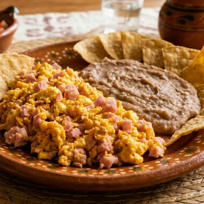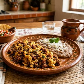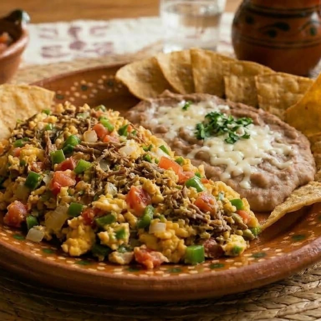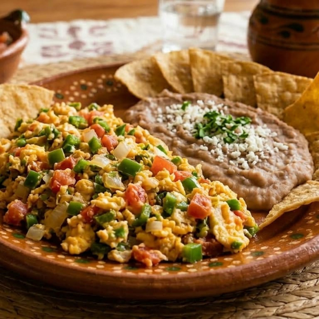 huevo con chile, tomate y cebolla acompañado con frijoles