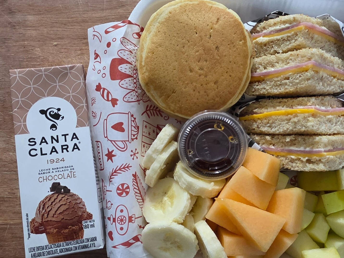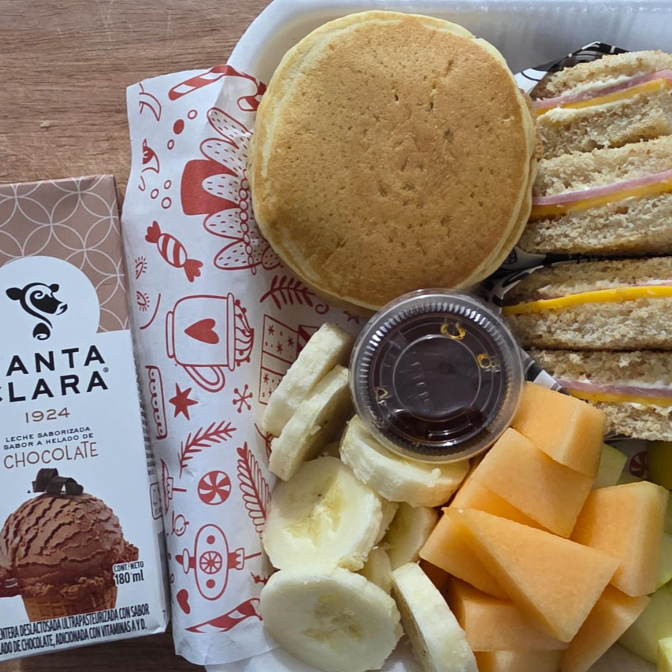3 mini hotcakes , sándwich jugo o chocolate y fruta de temporada.