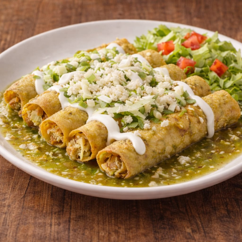 ORDEN DE 5 FLAUTAS ACOMPAÑADAS DE ENSALADA, SALSA VERDE CREMA