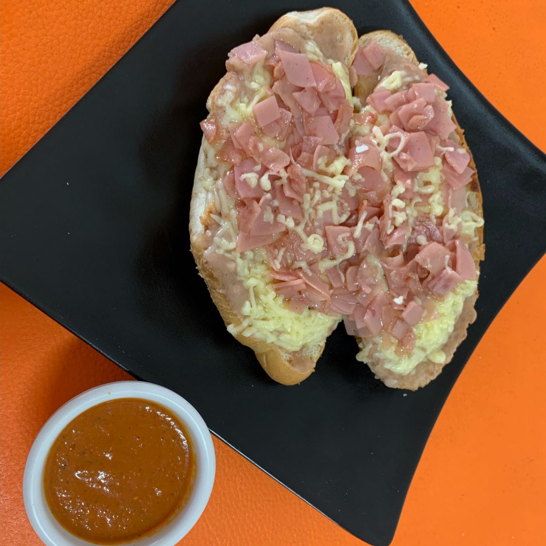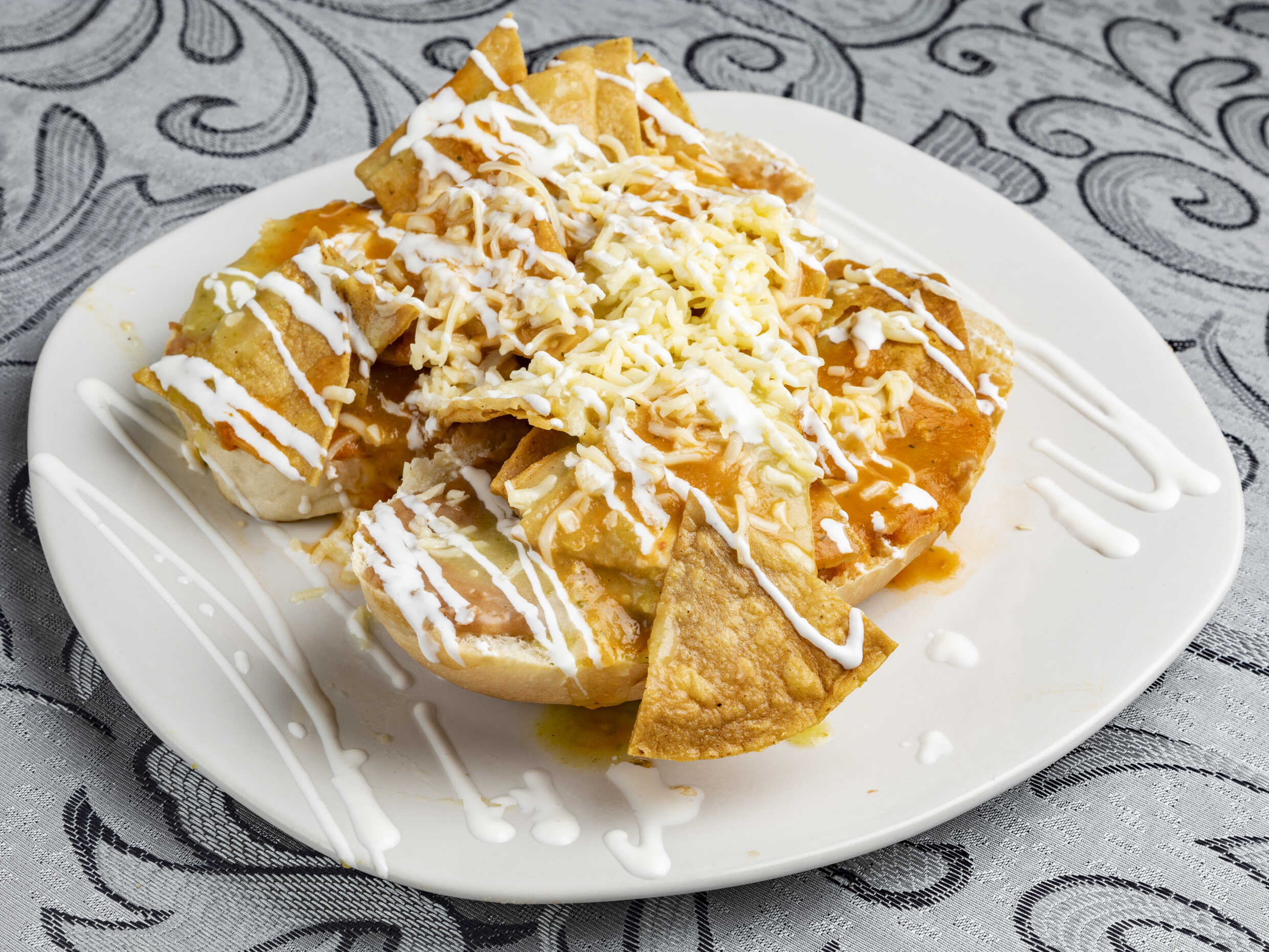 Bolillo, chilaquiles con chile de color, gratinados en queso gouda, acompañada de cebollita morada y frijolitos.