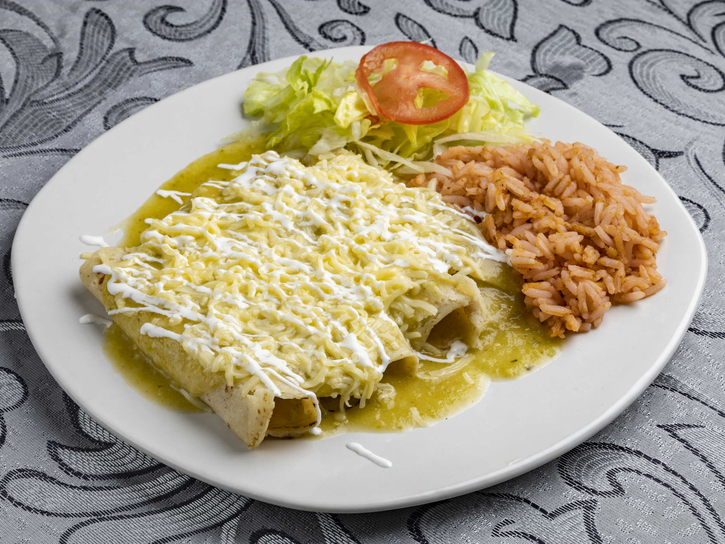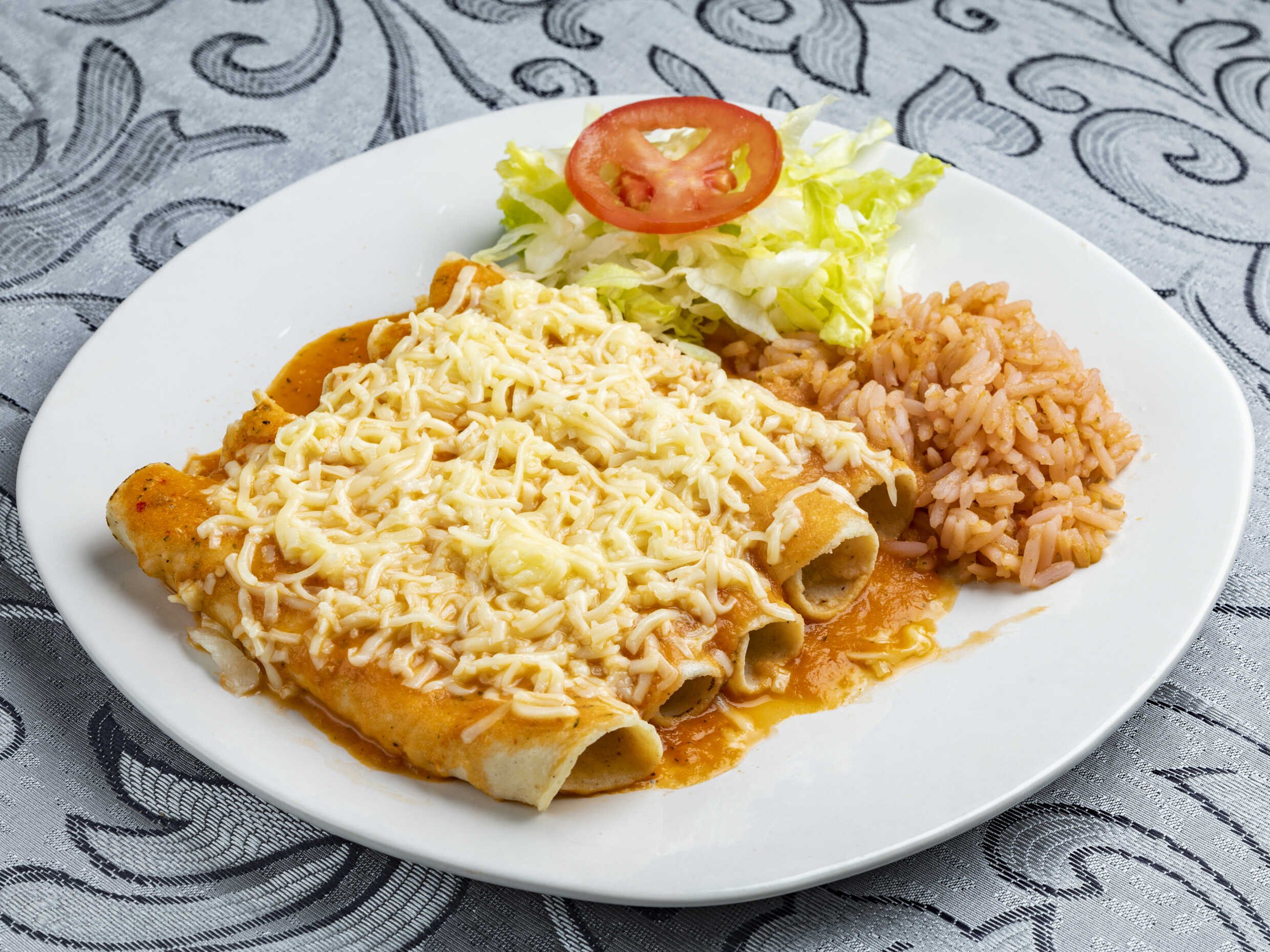 Pechuga de pollo envuelta en tortilla, bañadas en salsa roja, queso gratinado y crema.