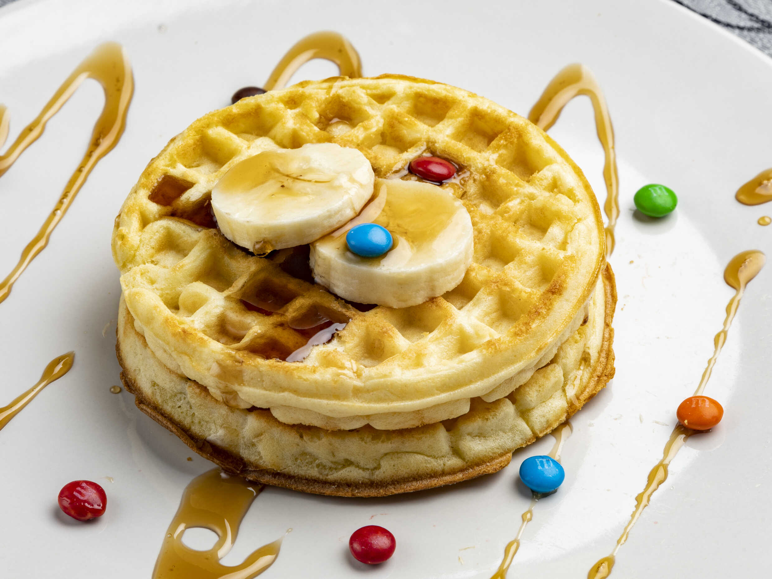 Waffles con mantequilla, queso gouda, jamón de pavo y un huevito estrellado.