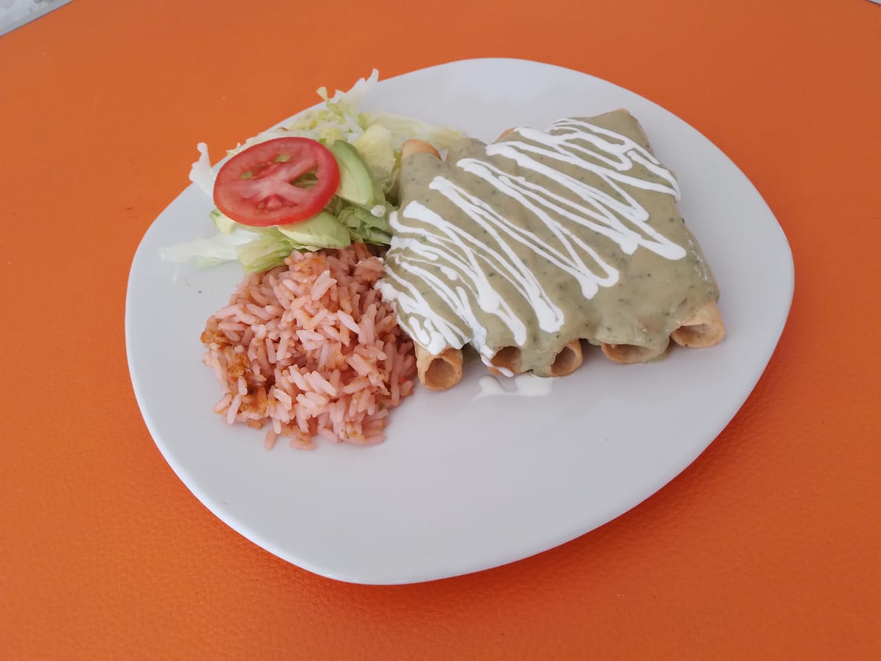 Flautas de res bañadas en salsa de guacamole con arroz lechuga crema y salsa