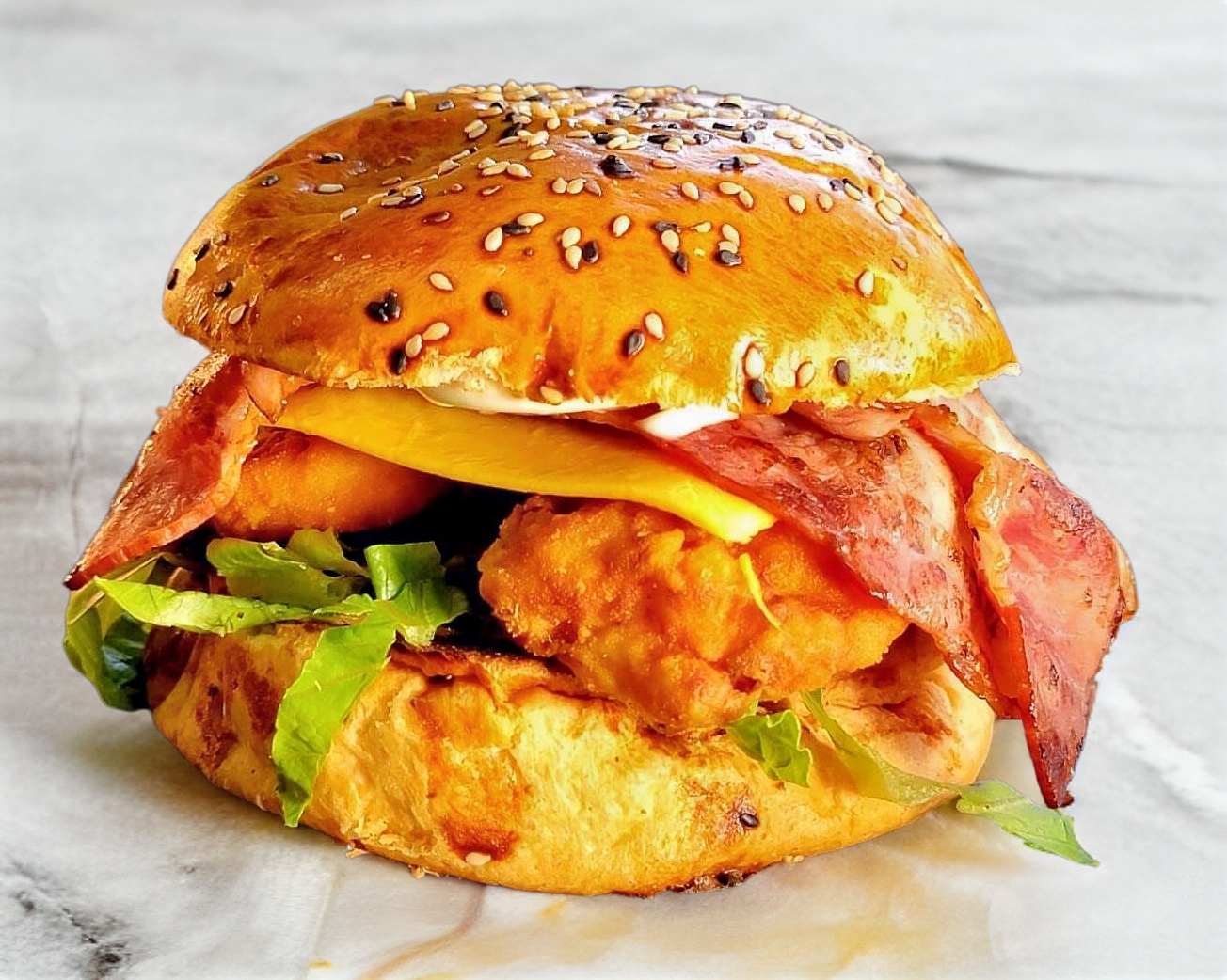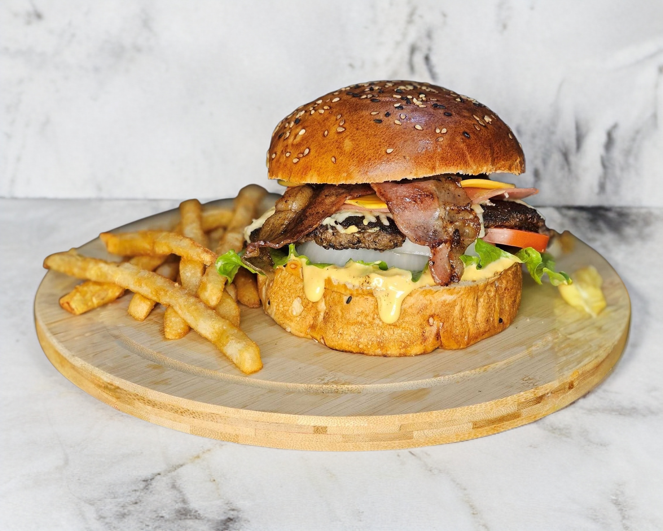 Hamburguesa de boneless, con queso amarillo, tocino, ranch, aderezo de la casa, lechuga, tomate y cebolla