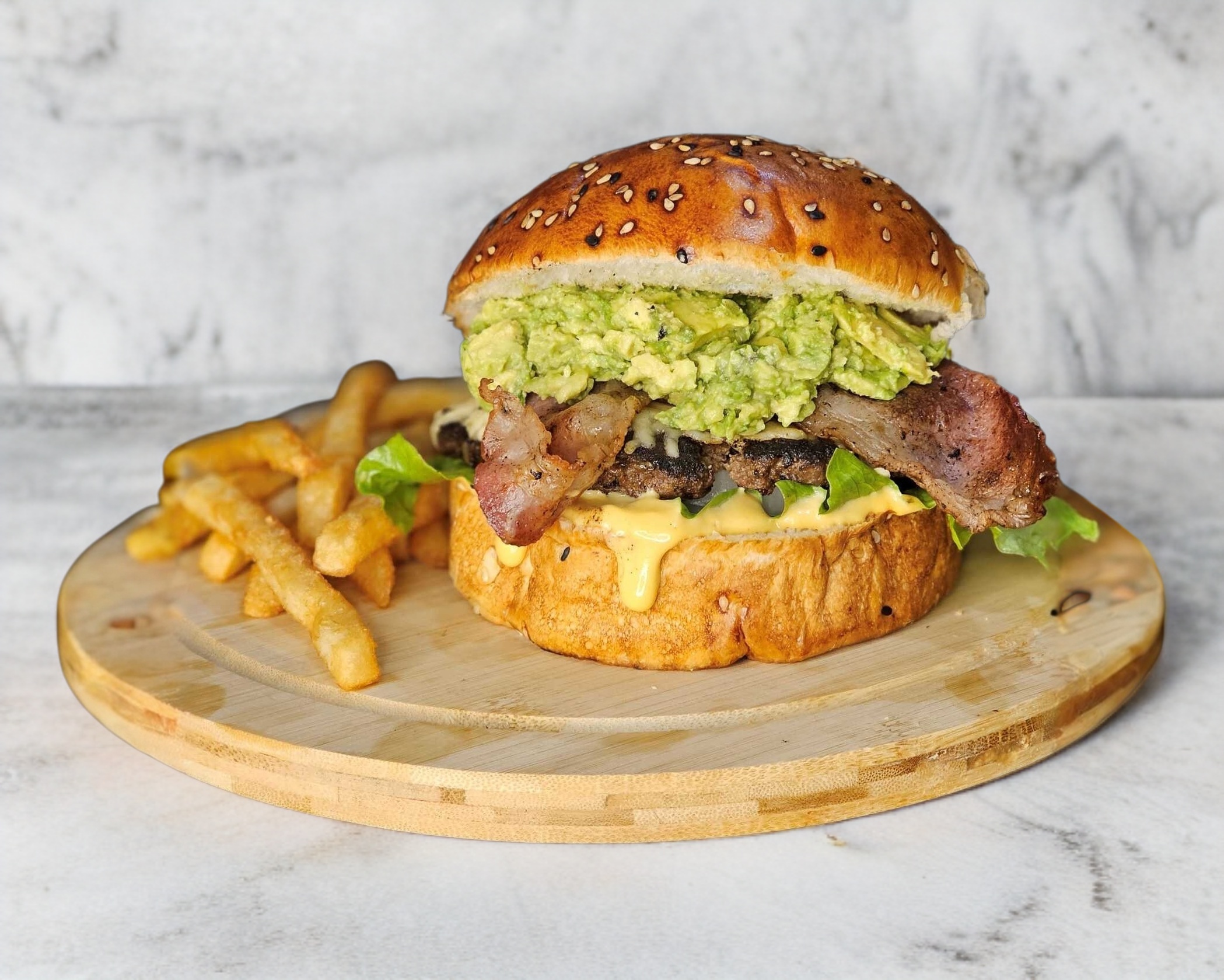 Deliciosa Carne de Res Casera, Pan artesanal, Guacamole, tocino, queso blanco, queso amarillo, jamon, aderezo de la casa, lechuga, tomate y cebolla