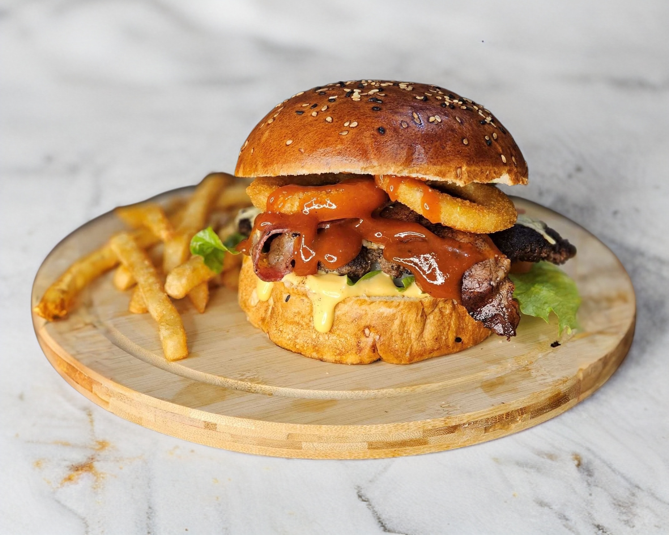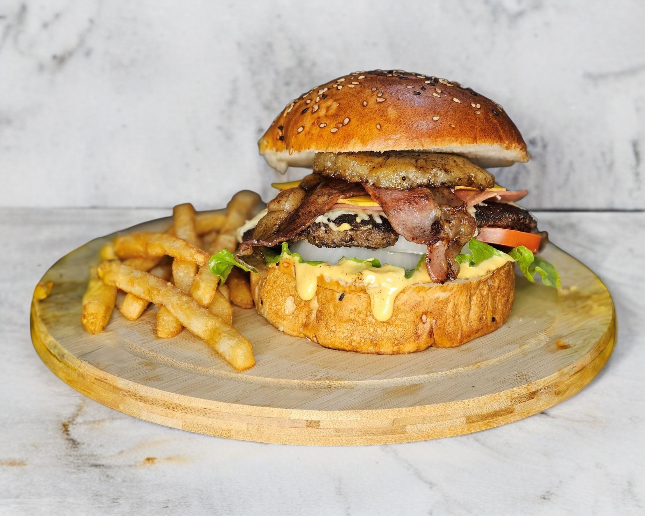 Deliciosa Carne de Res Casera, Pan artesanal, Aros de Cebolla con salsa BBQ y tocino, queso blanco, queso amarillo, jamon, aderezo de la casa, lechuga, tomate y cebolla