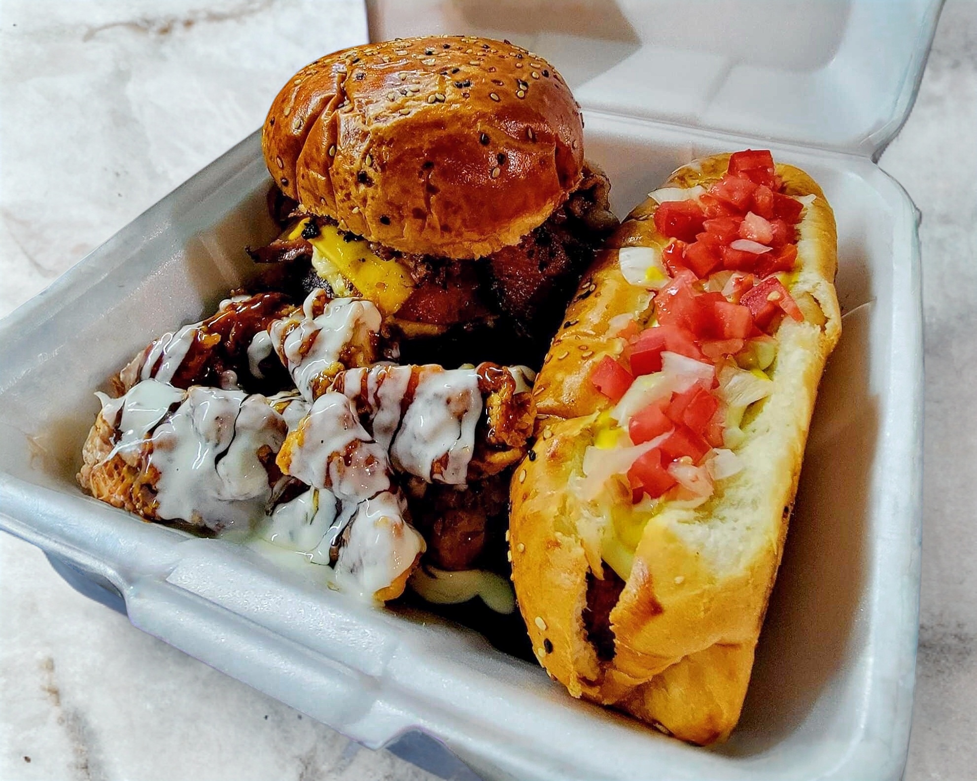 Hamburguesa Clasica, acompañada de una porcion de boneles y un hotdog sencillo
