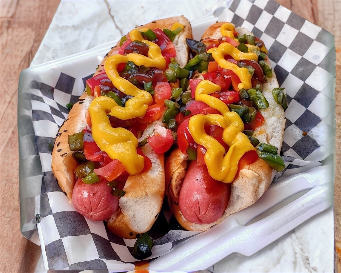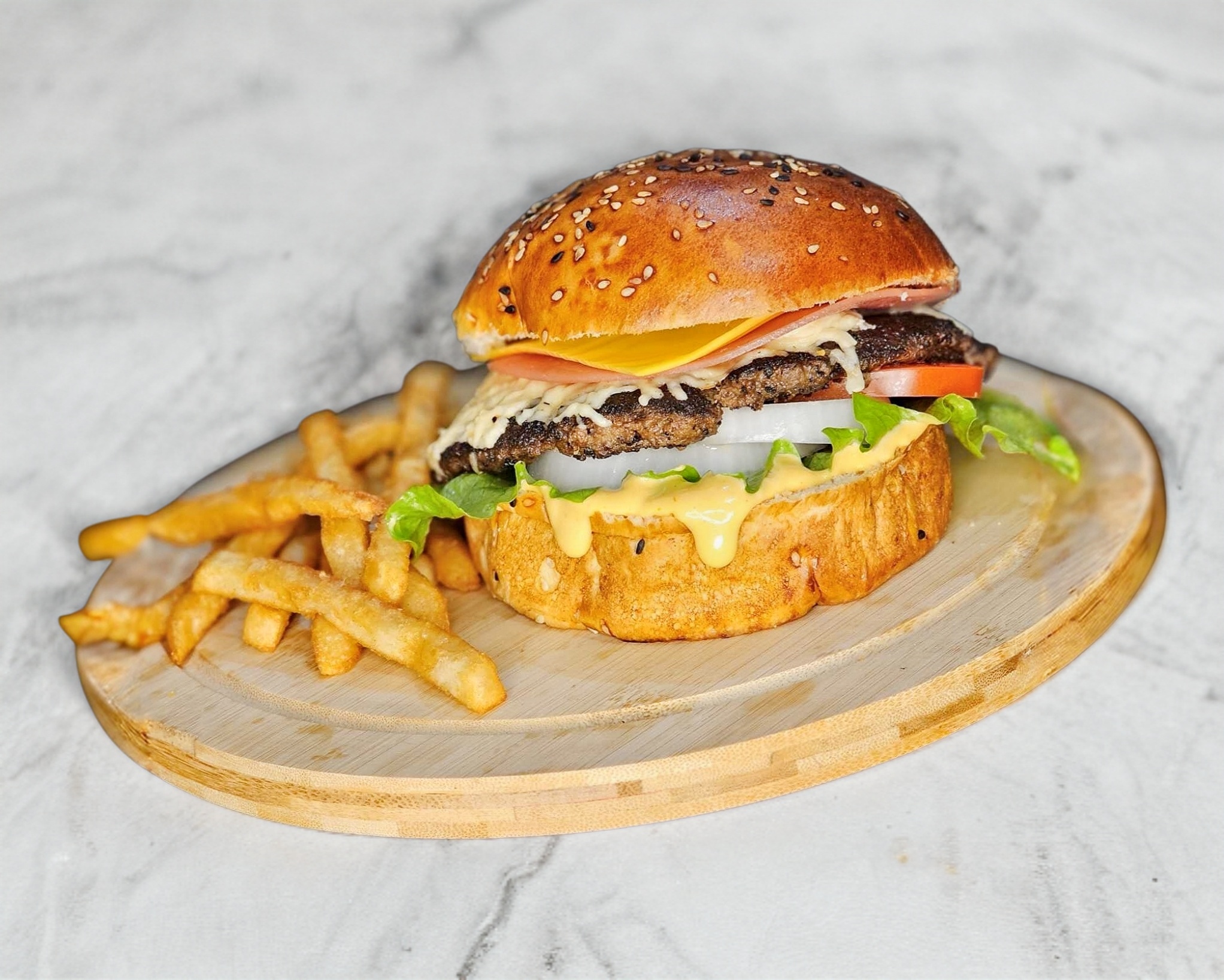 Dos Deliciosas Carnes de Res Casera, Pan artesanal, doble queso blanco, doble queso amarillo, doble jamon, aderezo de la casa, lechuga, tomate y cebolla