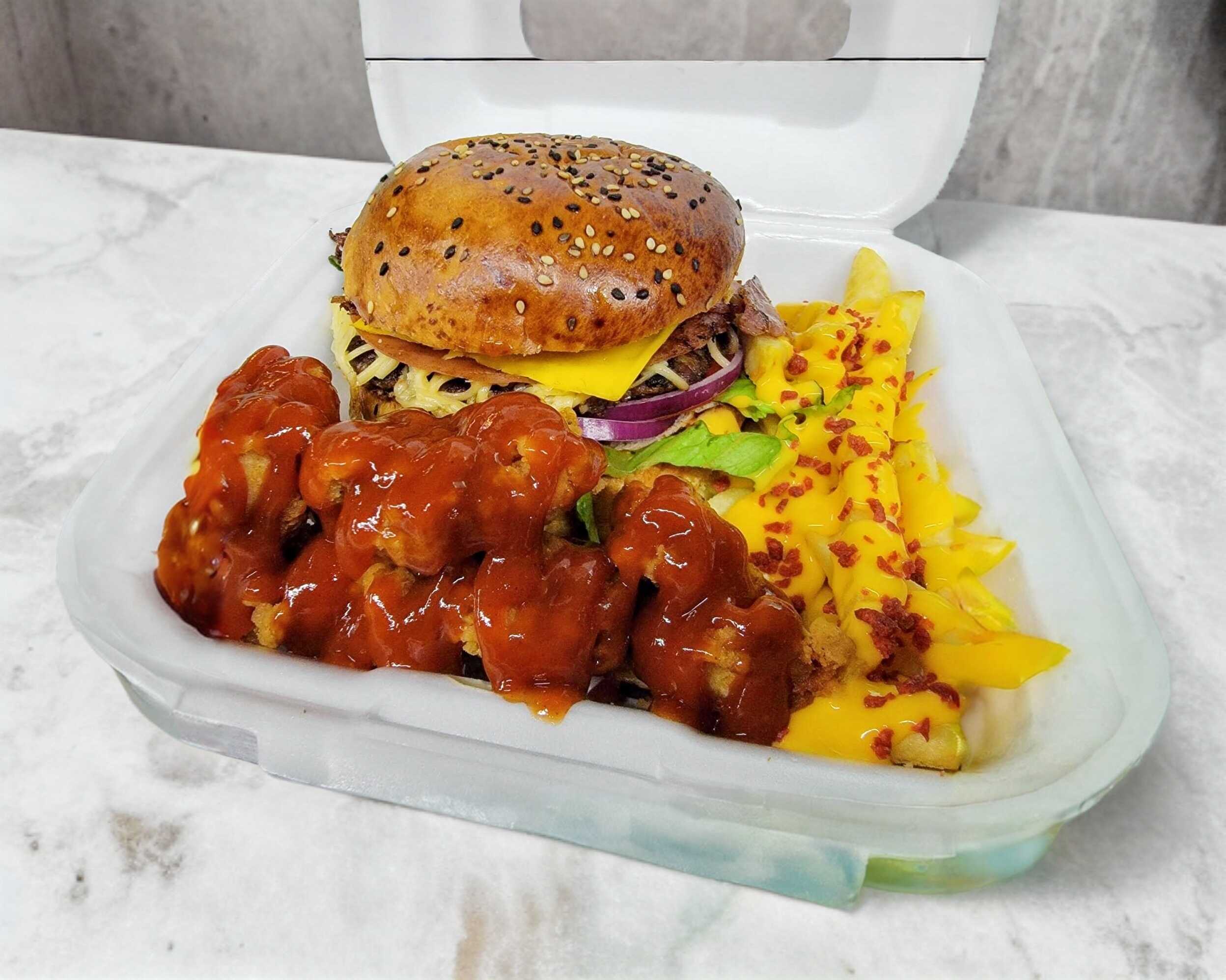 Hamburguesa Clasica acompañada de papas y una porcion de boneless que pueden ir en la salsa de su preferencia