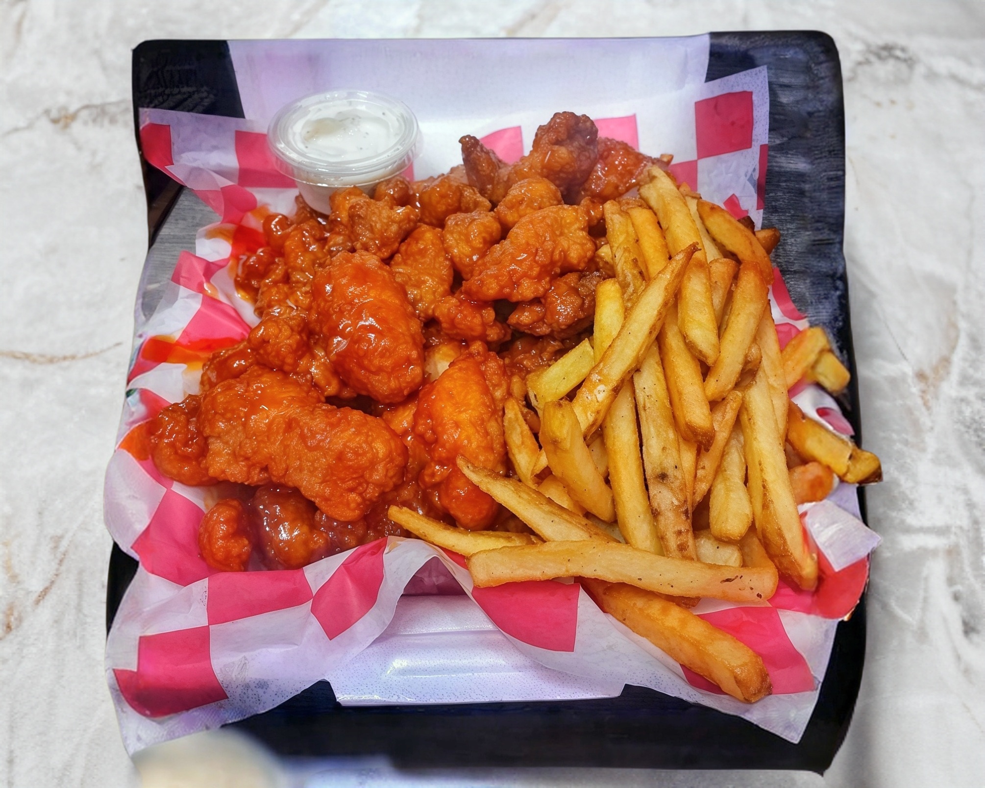 600gr de Boneless bañados en la salsa de su preferencia, acomañados de papas a la francesa, ranch, apio y zanahoria