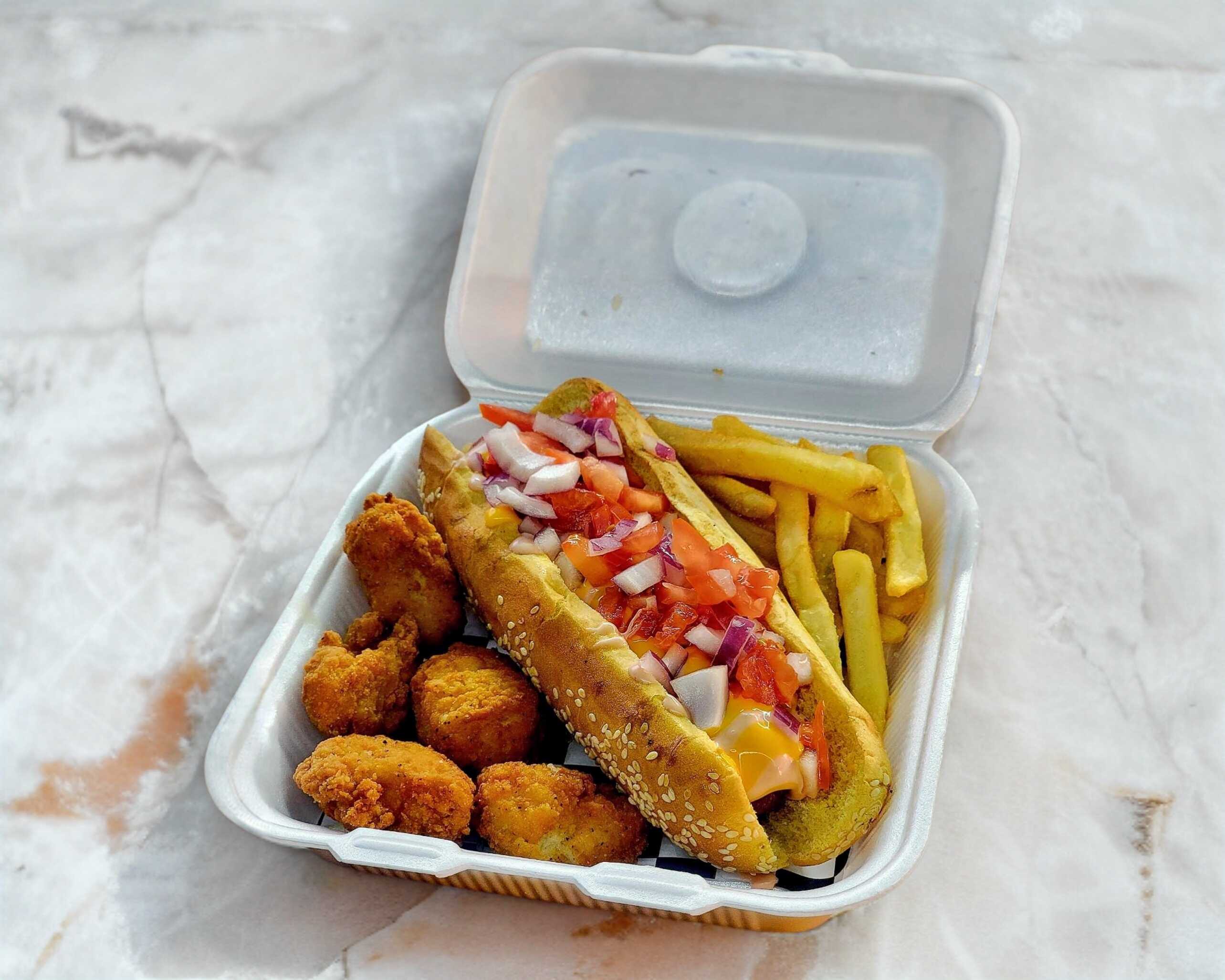 Hotdog sencillo acompañado de una porcion de boneles y papas