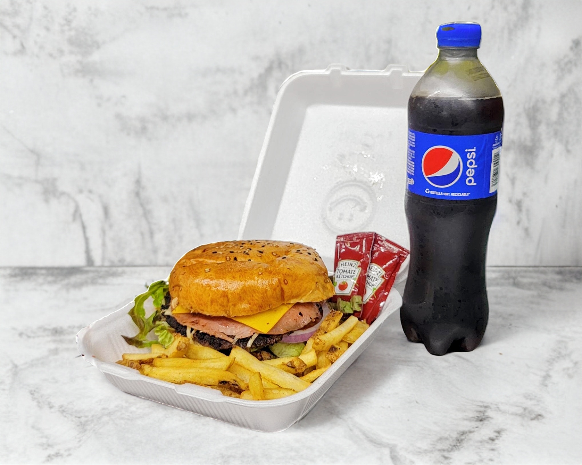Hamburguesa Clasica acompañada de papas y refresco de 600ml