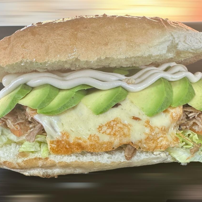 Jugosa pierna de puerco, jamón, queso chihuahua, lechuga, tomate, aguacate y crema.