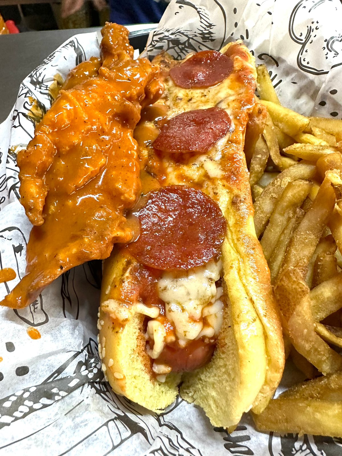 Salsa de tomate, pepperoni y queso gratinado (incluye papas).