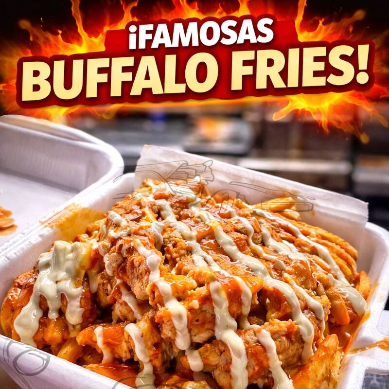 Hamburguesa de carne de res (170 gr), queso americano, guacamole, jitomate, cebolla, lechuga y pepinillos. Boneless bañados en salsa buffalo(3 pzas) y Papas a la francesa (100 gr) aderezo ranch y catsup.