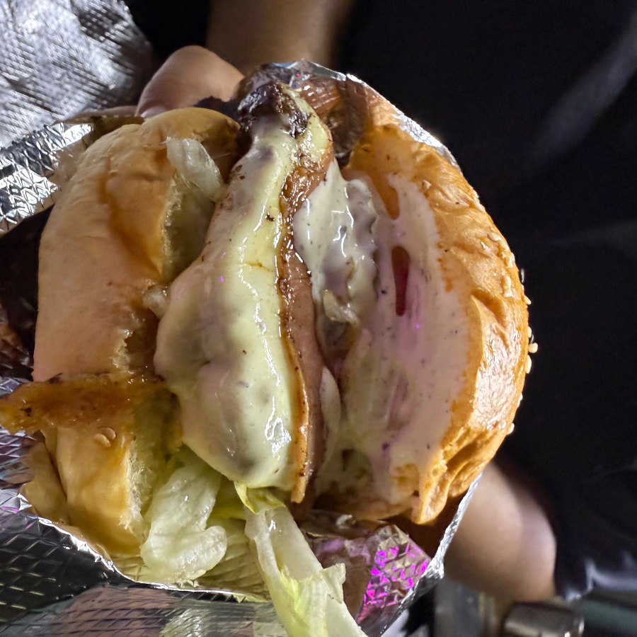 Triple carne, triple queso, cebolla asada, tocino y pan artesanal, lechuga, tomate, cebolla, pepinillos y aderezos BBQ.
