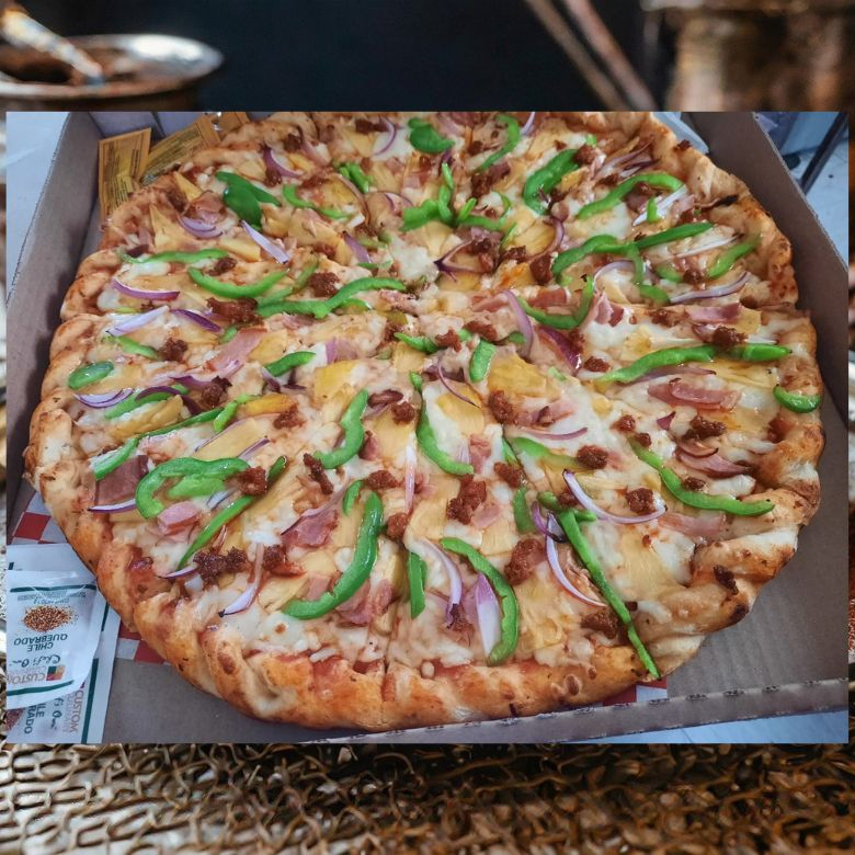 Delicioso pan con finas hierbas, salsa pomodoro, queso mozzarella, morrón, piña, cebolla, tocino y chorizo