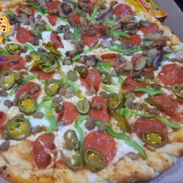 Delicioso pan con finas hierbas, salsa pomodoro, queso mozzarella, pepperoni, morrón, champiñones, jalapeño y salchicha italiana