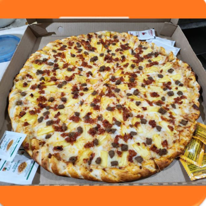 Delicioso pan con finas hierbas, salsa pomodoro, queso mozzarella, pepperoni, morrón, piña, chorizo y salchicha italiana