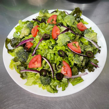 Lechuga italiana, tomate, aceitunas negras, pimiento morron, cebolla morada, brócoli y pimienta