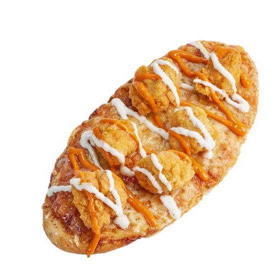 Pizza ligeramente crujiente con boneless, salsa buffalo y aderezo ranch