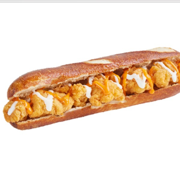 Baguette con boneless, queso gouda, salsa buffalo y aderezo ranch
