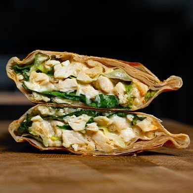 Triángulo sellado en tortilla a elegir, relleno de pollo a la plancha, lechuga fresca, queso parmesano y aderezo César cremoso. Incluye aderezo a elegir. Papas se venden por separado.