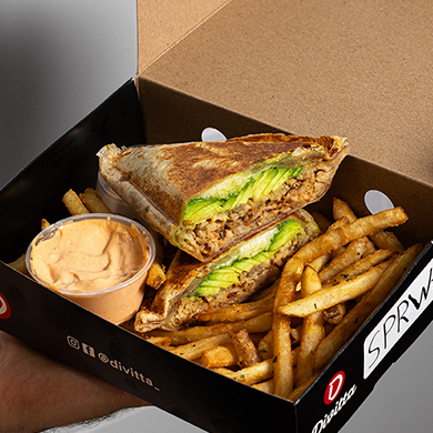 Divitta de pollo a la plancha con salsa Buffalo y queso gratinado en tortilla a elegir, no incluye papas.