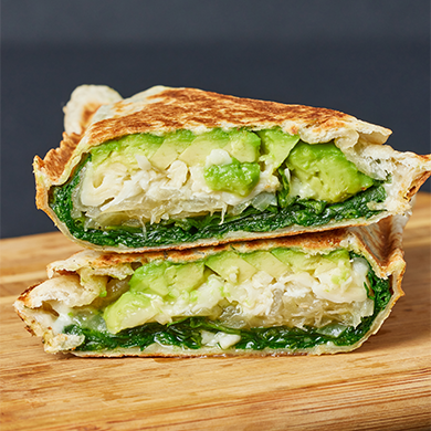 Divitta de pollo a la plancha en tortilla de avena, pimiento rojo y espinacas con queso panela, incluye 150 gm de camote fries.