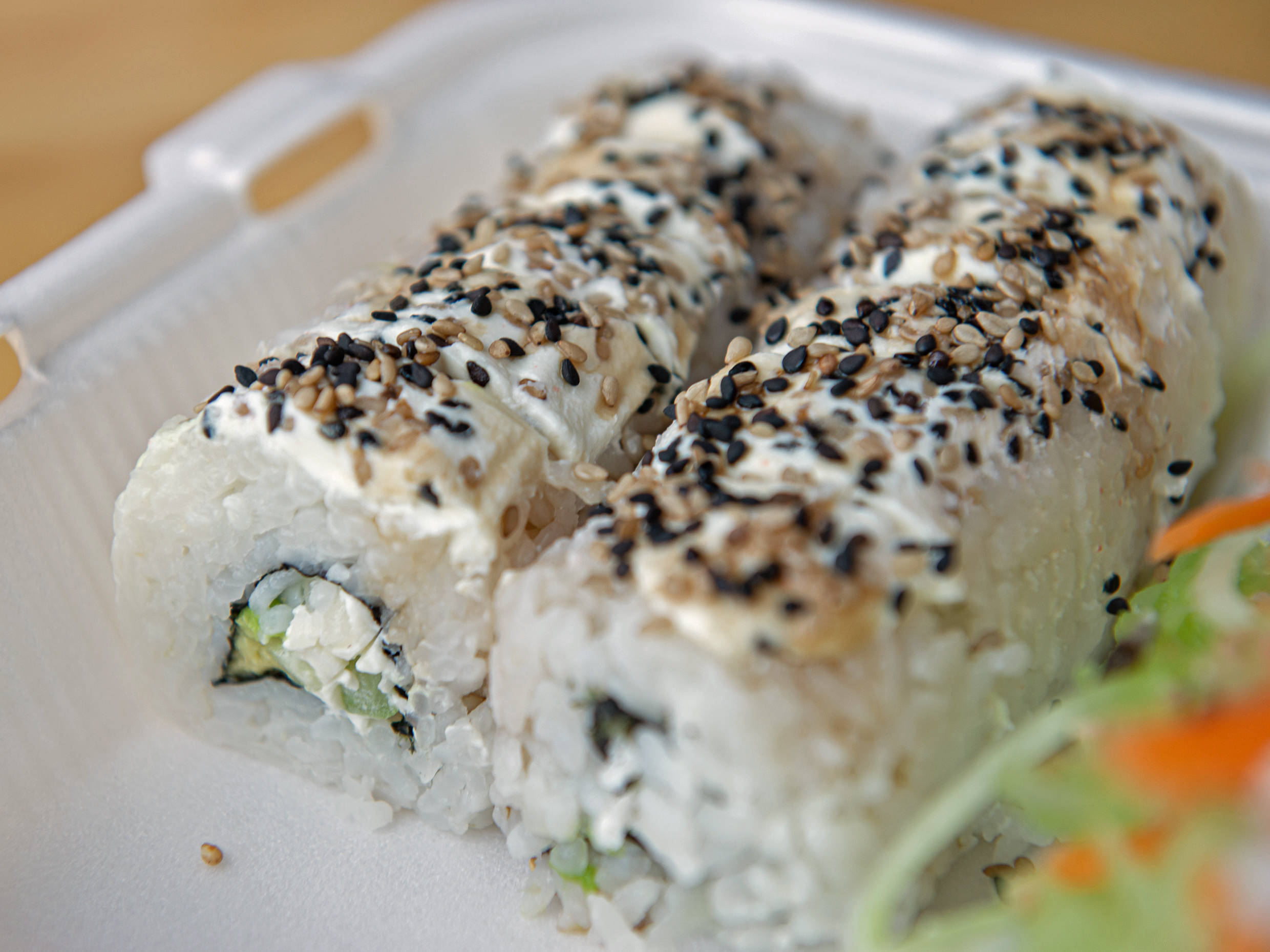 Camarón empanizado, aguacate, queso crema, pepino, por fuera pasta tampico nevado de furikake.