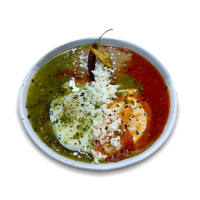 En salsa de tu elección, acompañados de frijolitos, mix de quesos, crema, cebolla y cilantro