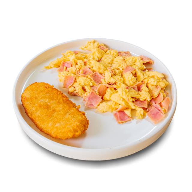 Huevos al gusto (revuelto, con jamón o estrellados) acompañado de papa hash brown.