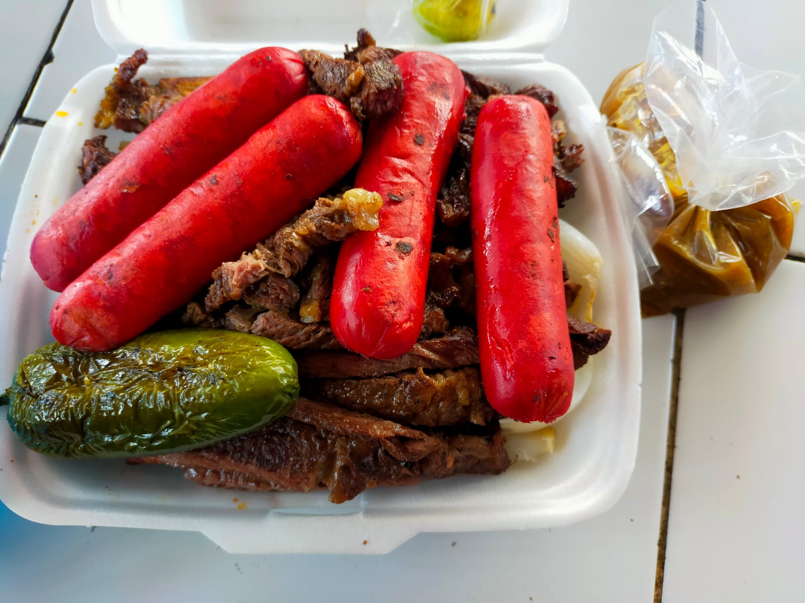 Incluye, salchicha, cebolla, tortillas, salsa chile toreano y limón