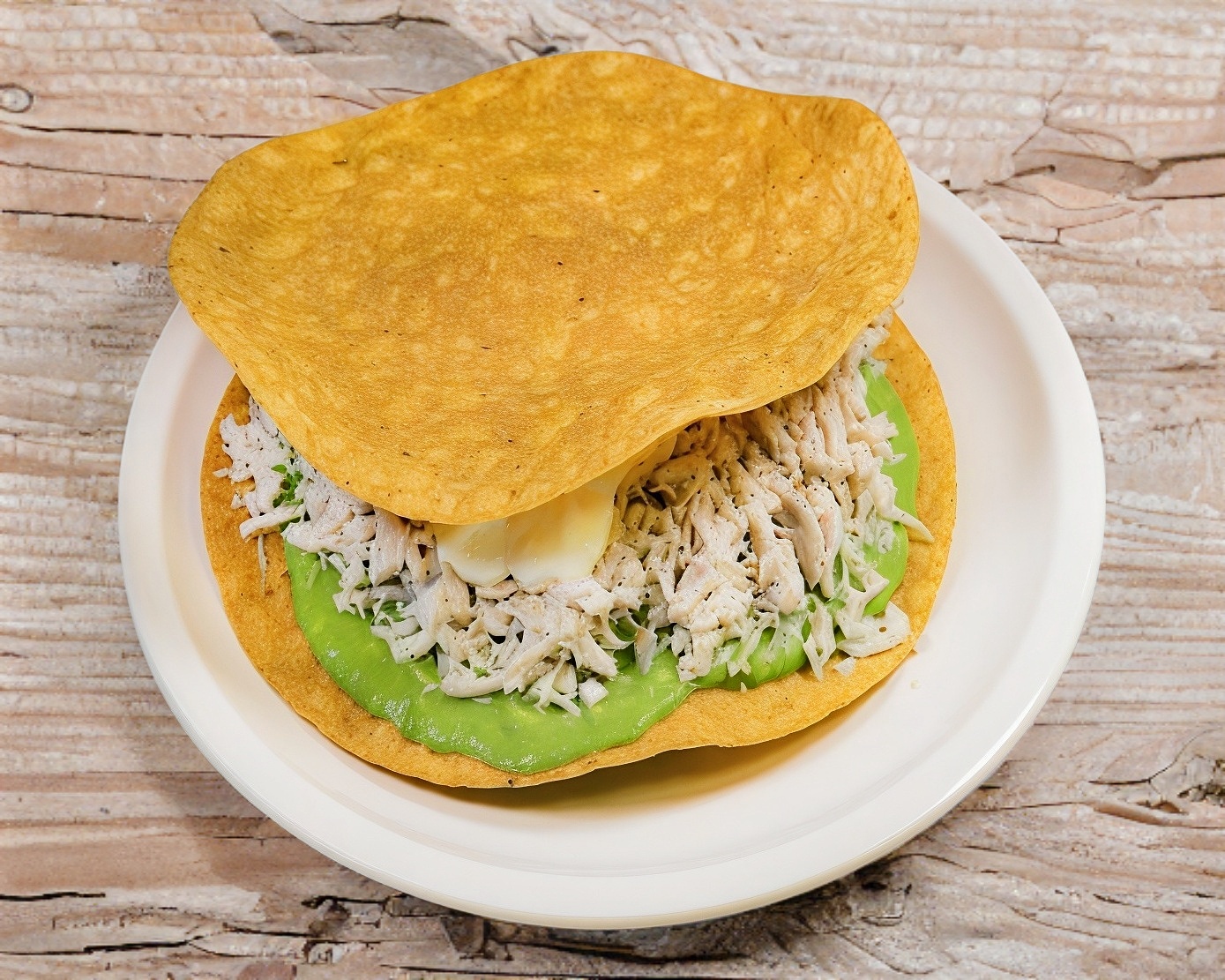 Porción personal: Tostada de pechuga por encima y por debajo, con crema, guacamole y chiles en vinagre (incluye consomé y bebida de 500 ml).
