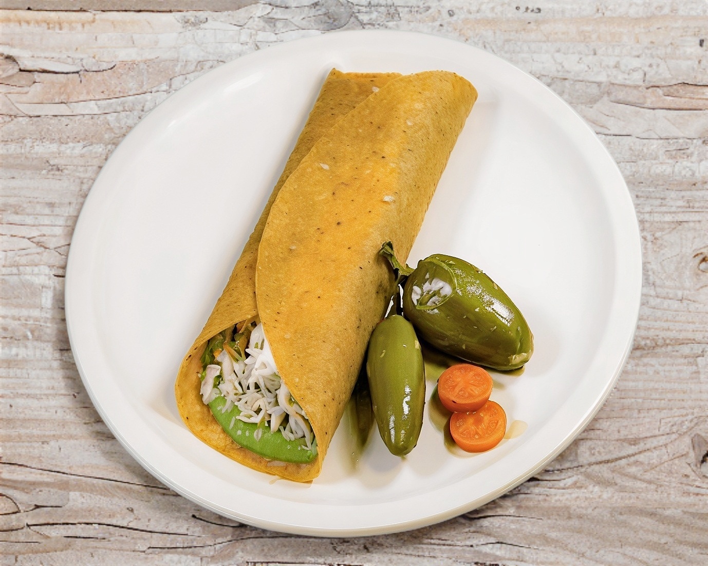 Tortilla jr con pechuga desmenuzada, crema, guacamole. Chiles en vinagre
