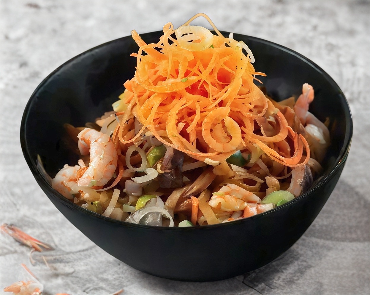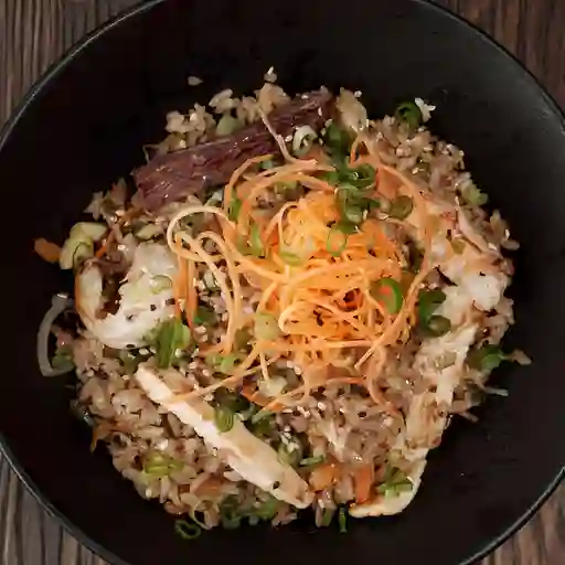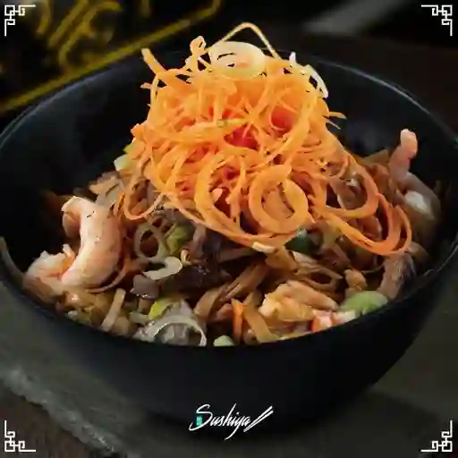 PASTA A BASE DE HUEVO CON MIX DE VERDURAS, ARRACHERA, POLLO AL GRIL Y CAMARON, BAÑADOS EN SALSA TERIYAKI