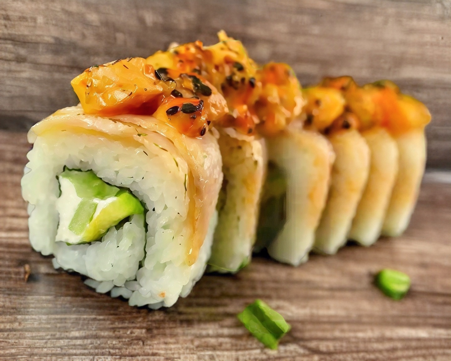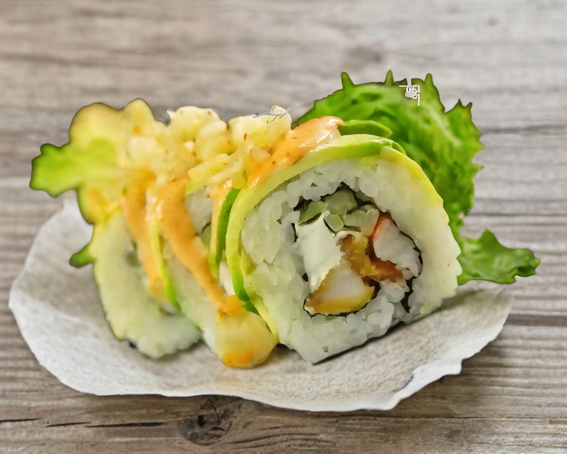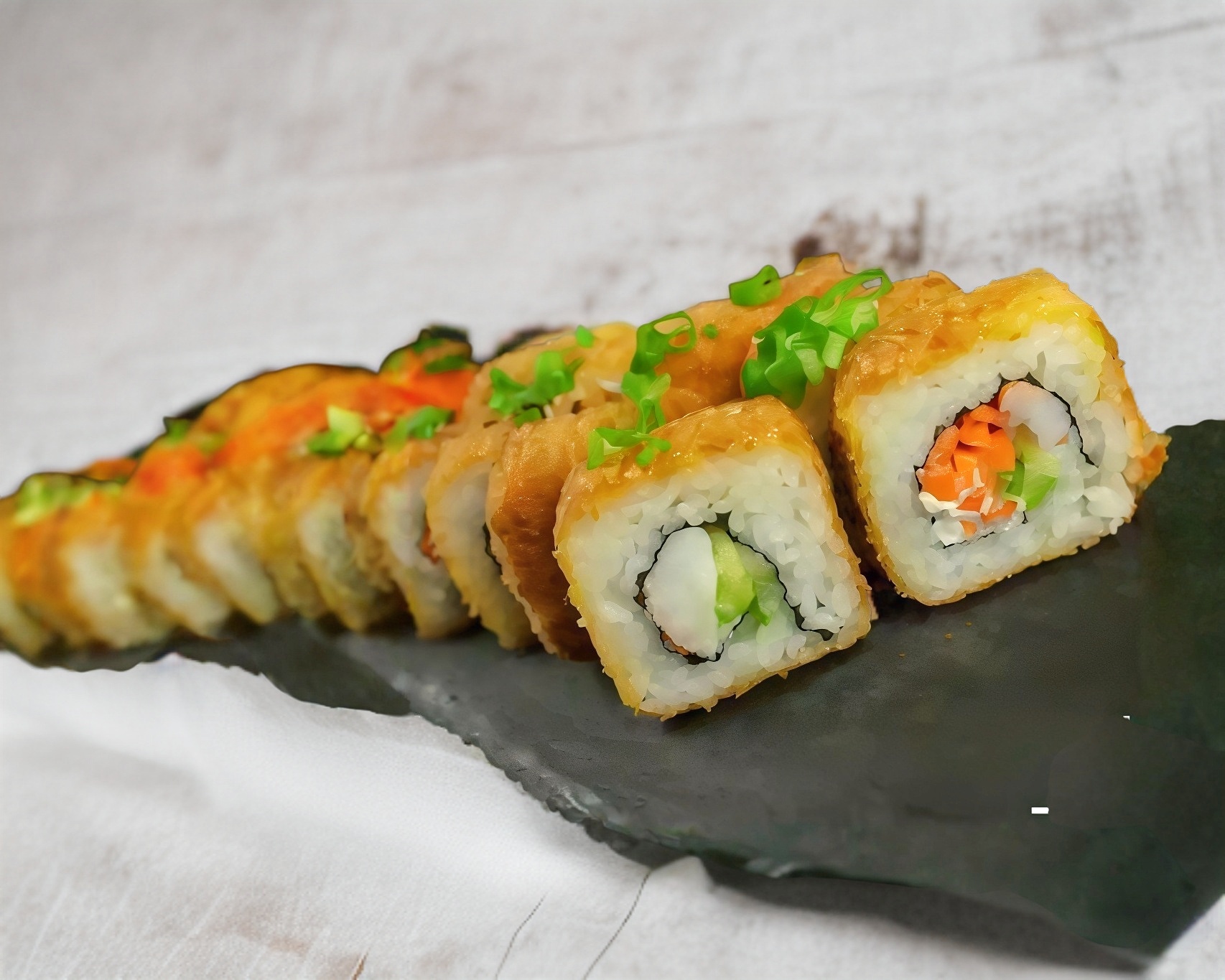 ROLLO FRIO CON CAMARON EMPANIZADO, KANIKAMA, PEPINO, QUESO CREMA Y MONTADO SOBRE AGUACATE Y LLUVIA DE TEMPURA