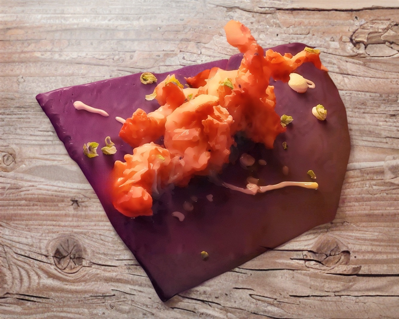 ESFERAS DE TRIGO RELLENAS DE PULPO, ACOMPAÑADAS DE SALSA TONKATSU, MAYONESA AHUMADA, KATSUBUSHI Y CENOLLIN
