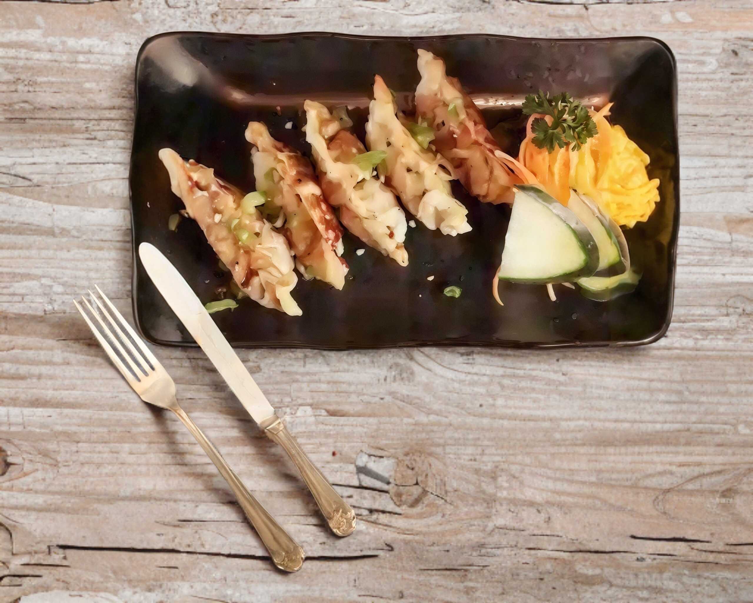 5 PIEZAS RELLENAS DE CARNE DE RES Y CERDO ACOMPAÑADAS CON SALSA PONZU