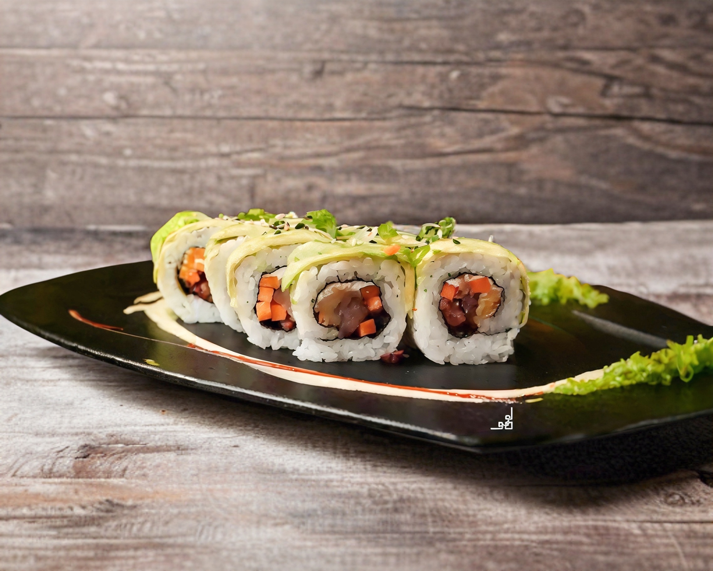 ROLLO FRIO CON AGUACATE, PEPINO, ZANAHORIA Y QUESO CREMA, MONTADO SOBRE CAMARON, CHICHARON DE ATUN GLASEADO EN SALSA TERIYAKI