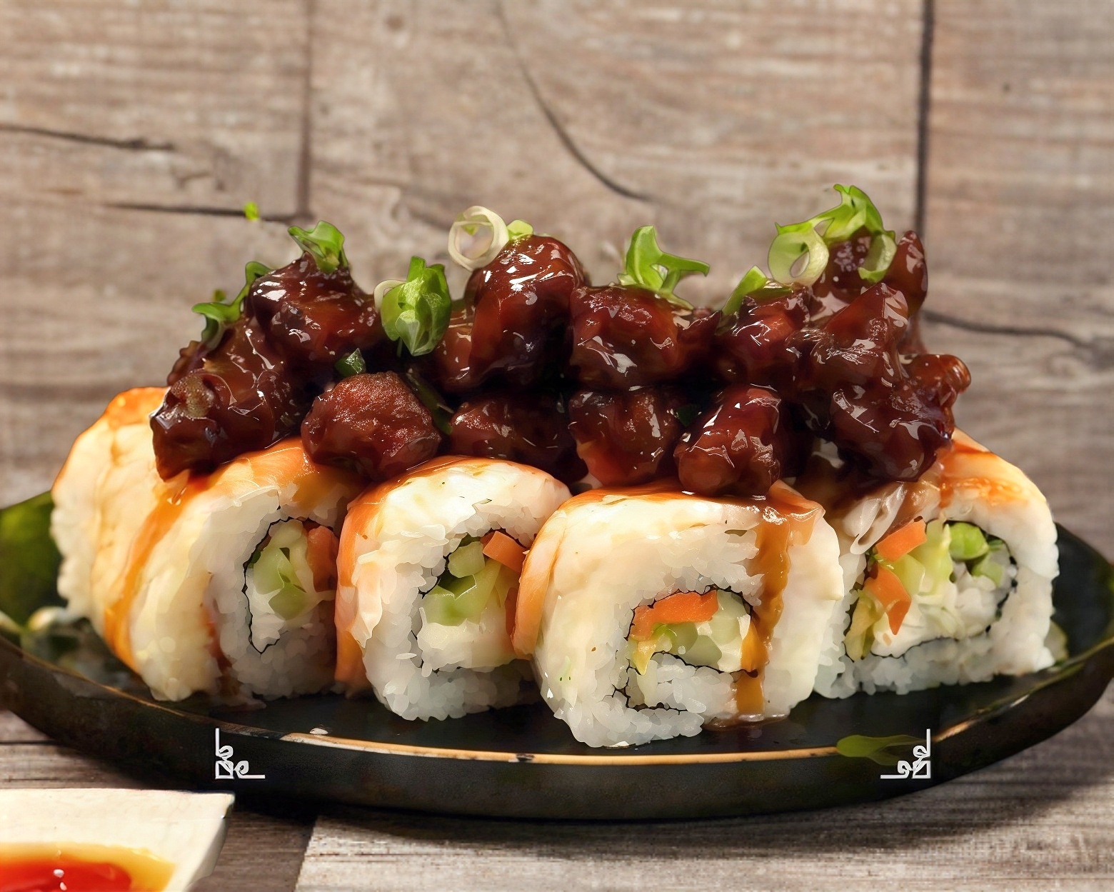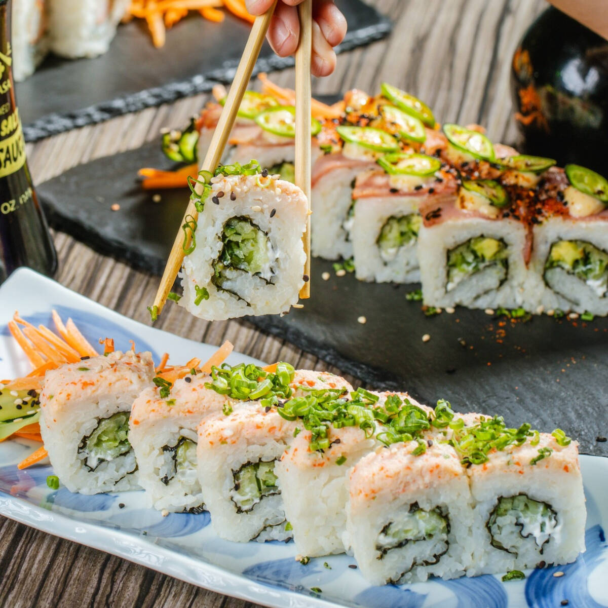 ROLLO FRIO CON ALGA POR FUERA CON ARRACHERA, CEBOLLA CARAMELIZADA, ZANAHORIA Y QUESO CREMA, MONTADO DE GUACAMOLE Y QUESO MANCHEGO GRATINADO.