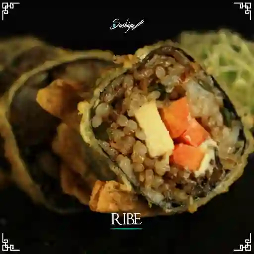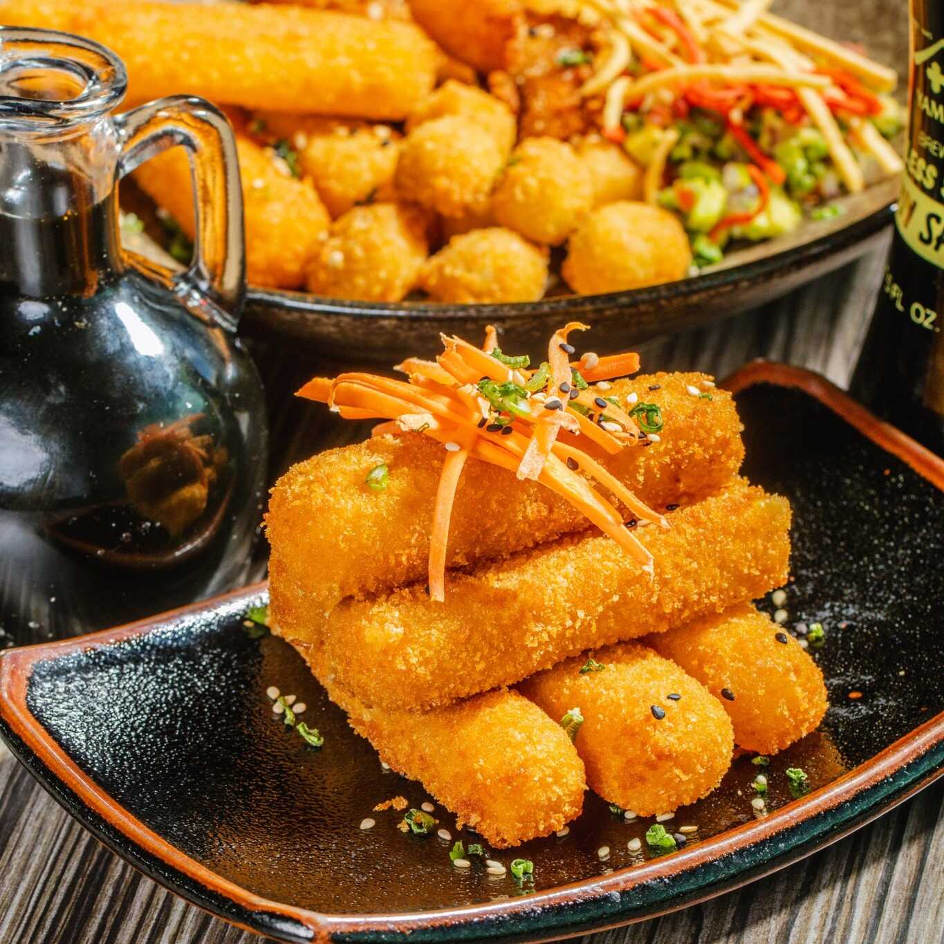 ROLLO TEMPURA CON POLLO A LA PLANCHA, TOCINO FRITO, ZANAHORIA Y QUESO CREMA.