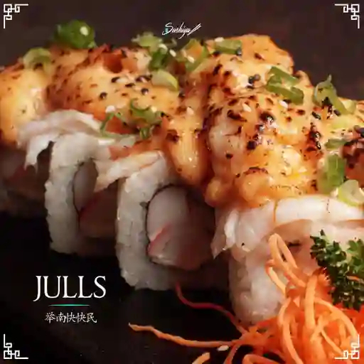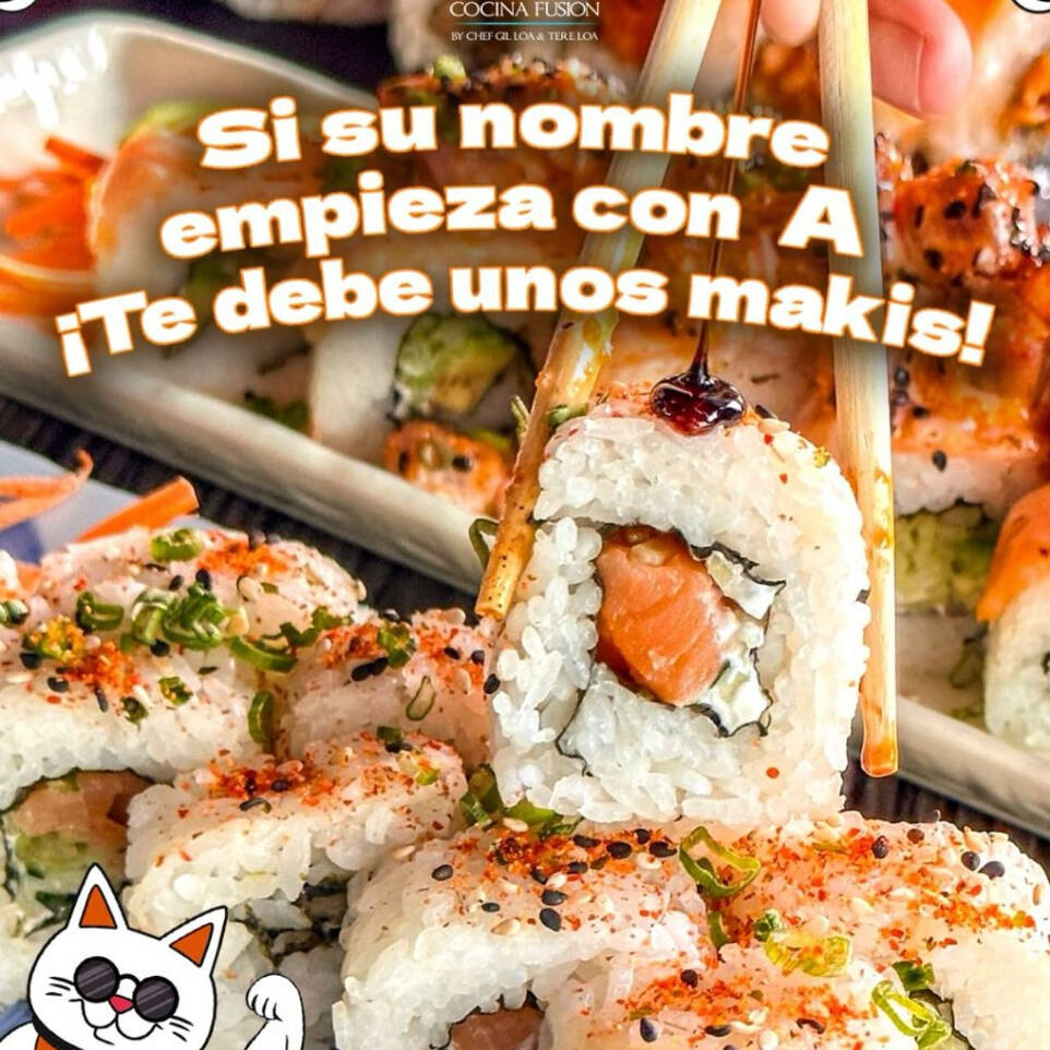 ROLLO FRIO CON TANUKI SPICY MONTADO DE CHISPAS TEMPURA CON SALOM FRESCO.