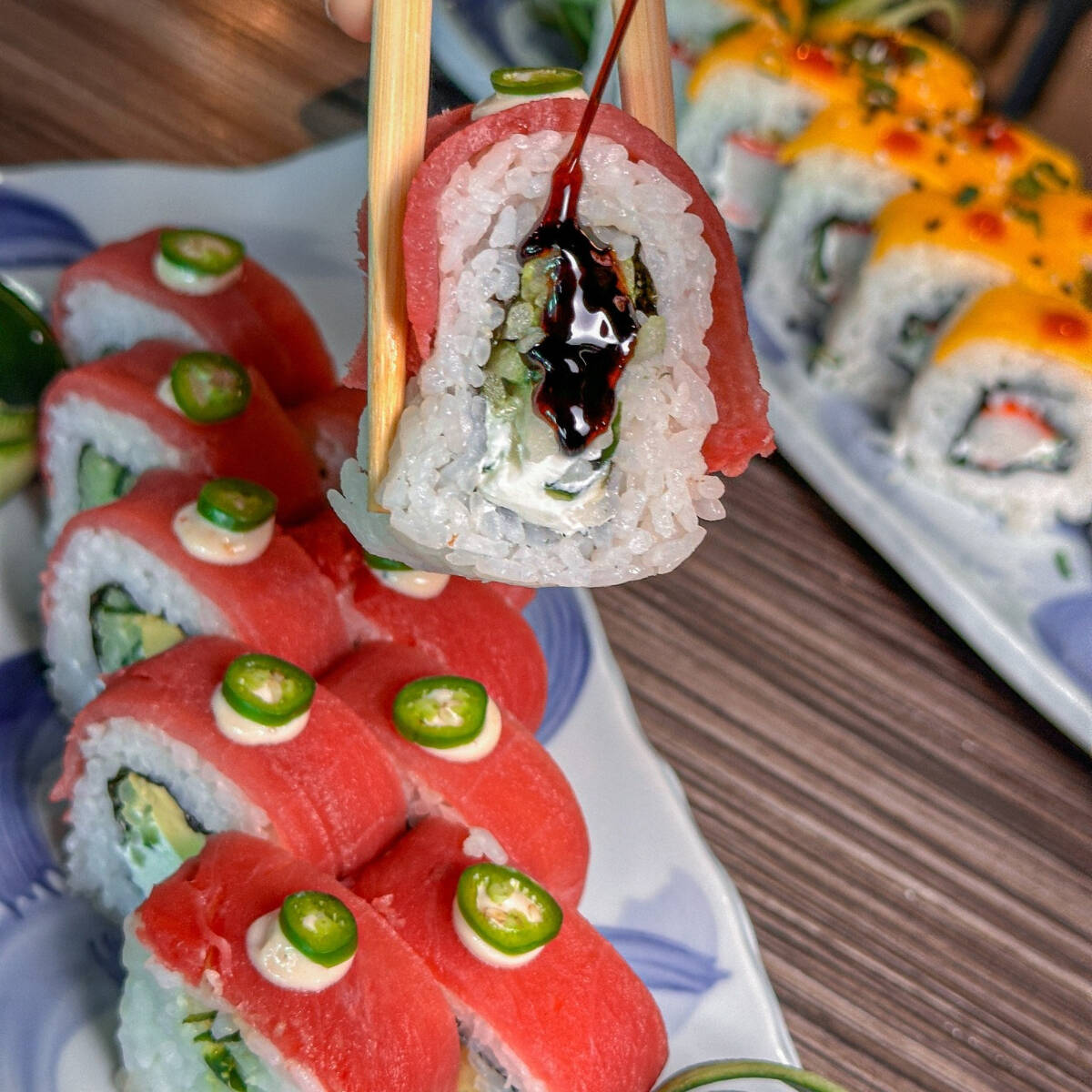 ROLLO FRIO CON ATIUN CON COSTRA DE TOGARASHI, PEPINO, QUESO CREMA Y MONTADO DE AGUYACATE Y PASTA TAMPICO.