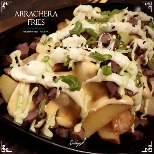 PAPAS FRANCESAS CON MIX DE QUESO FUNDIDO, ARRACHERA Y LIGUERO TOQUE DE MAYONESA AHUMADA