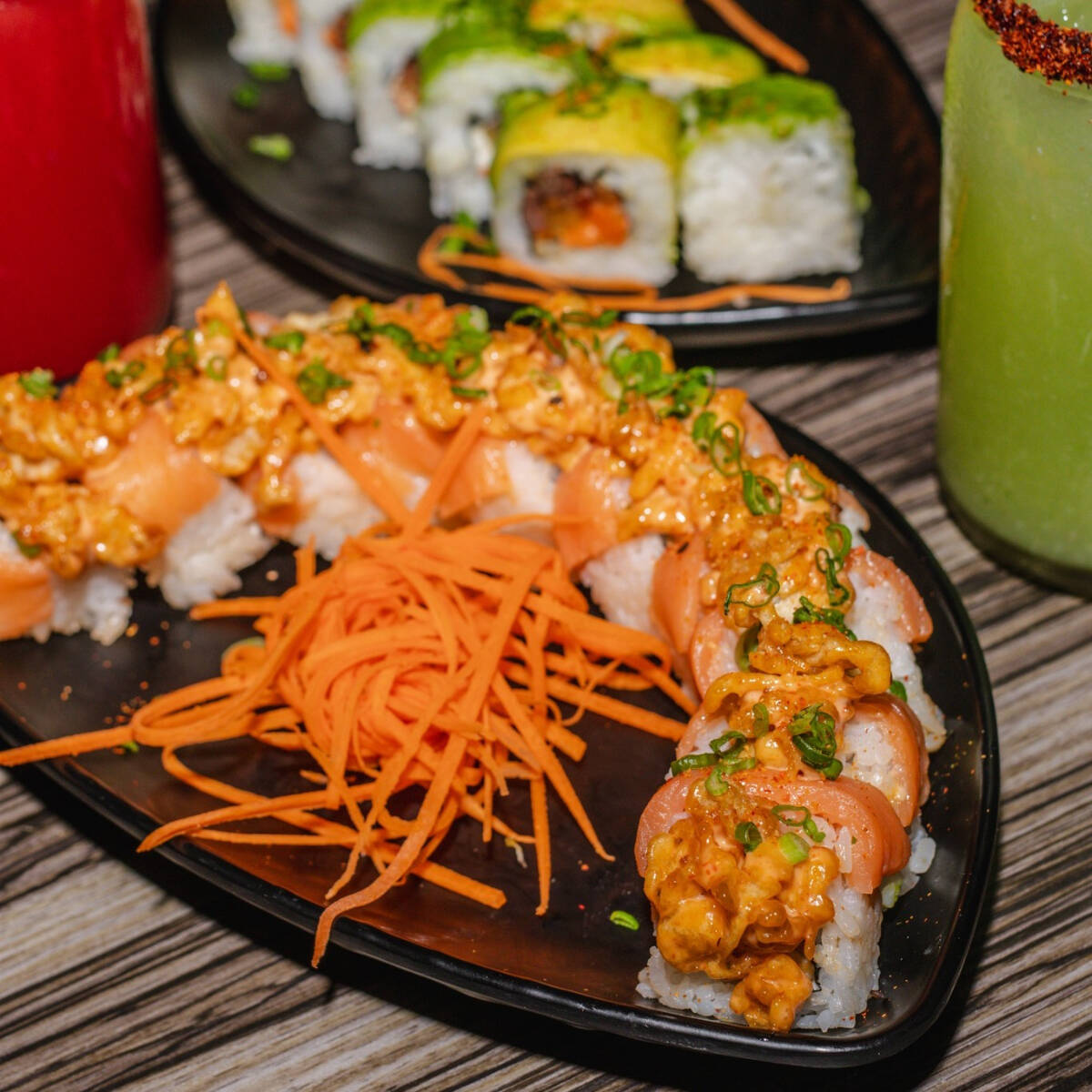 ROLLO FRIO CON ZANAHORIA, AGUACATE, CEBOLLA MORADA Y QUESO CREMA, MONTADO DE SALMON Y CHILE SERRANO