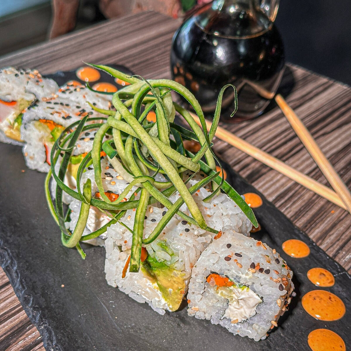 ROLLO FRIO CON PEPINO, ZANAHORIA Y GERMINADO DE SOYA, PIMIENTO. VERDE, CHILES TOREADOS, AGUACATE Y QUESO CREMA Y CUBIERTO DE AJONJOLI