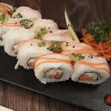 ROLLO FRIO CON ZANAHORIA, PEPINO, QUESO CREMA MONTADO DE SALMON Y KANIKAMA.